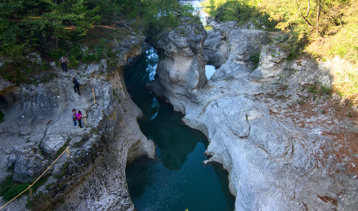 Посещение Хаджохской теснины, где река Белая бурлящими горными потоками образовала изумительный по красоте каньон. Глубина каньона достигает 40 м., при длине 450-500 м. Ширина каньона 6-7 м., а в некоторых местах не более 2 м. Вода бурлит и пенится, зажатая между двух берегов. Белые известняковые стены каньона смотрятся причудливо. Местами они отвесные, гладкие, местами – выпуклые, изогнутые, а кое-где в них потоком воды вымыты ниши. Мощь и напор водной стихии вызывает трепет, восхищение и уважение к силам природы. Тропа приведет к памятнику природы и истории — Аминовой площадке — месту казни провинившихся адыгов и пленных русских солдат.